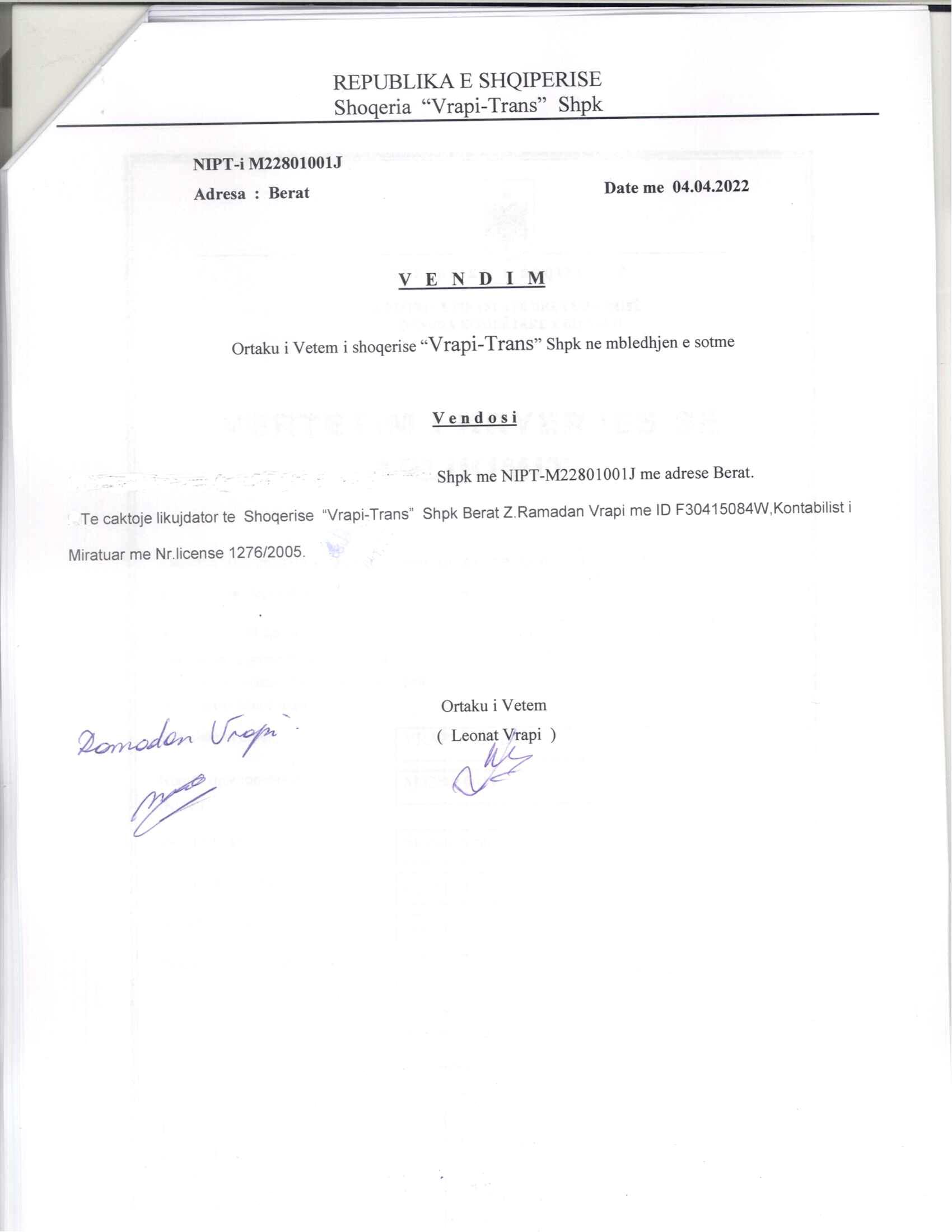 | Çështje Ligjore: | I. Me datë 04.04.2022, me vendim të ortakut të vetëm, u vendos prishja e shoqërisë dhe fillimi i procedurave të likuidimit, dhe caktimi i likuidatorit Ramadan Vrapi.
