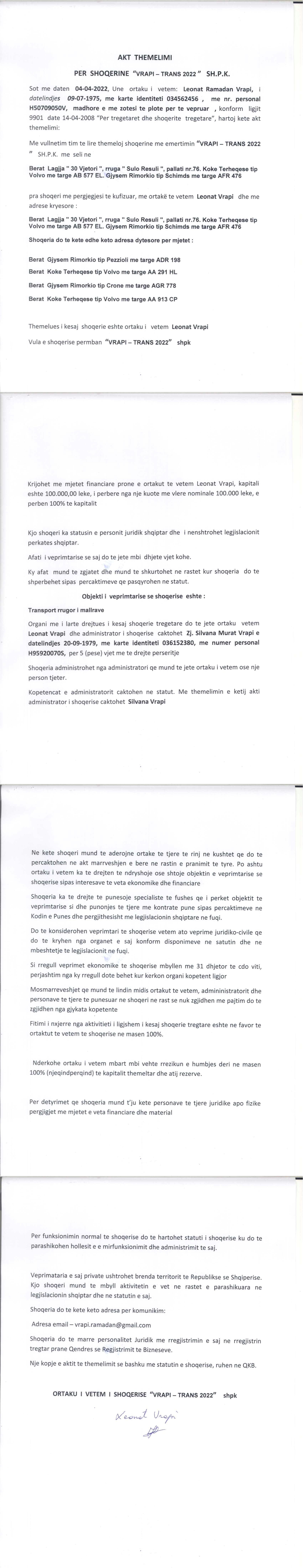→ Ekstrakti Historik i Regjistrit Tregtar date 11.04.2022 → Akt themelimi i Shoqerise |