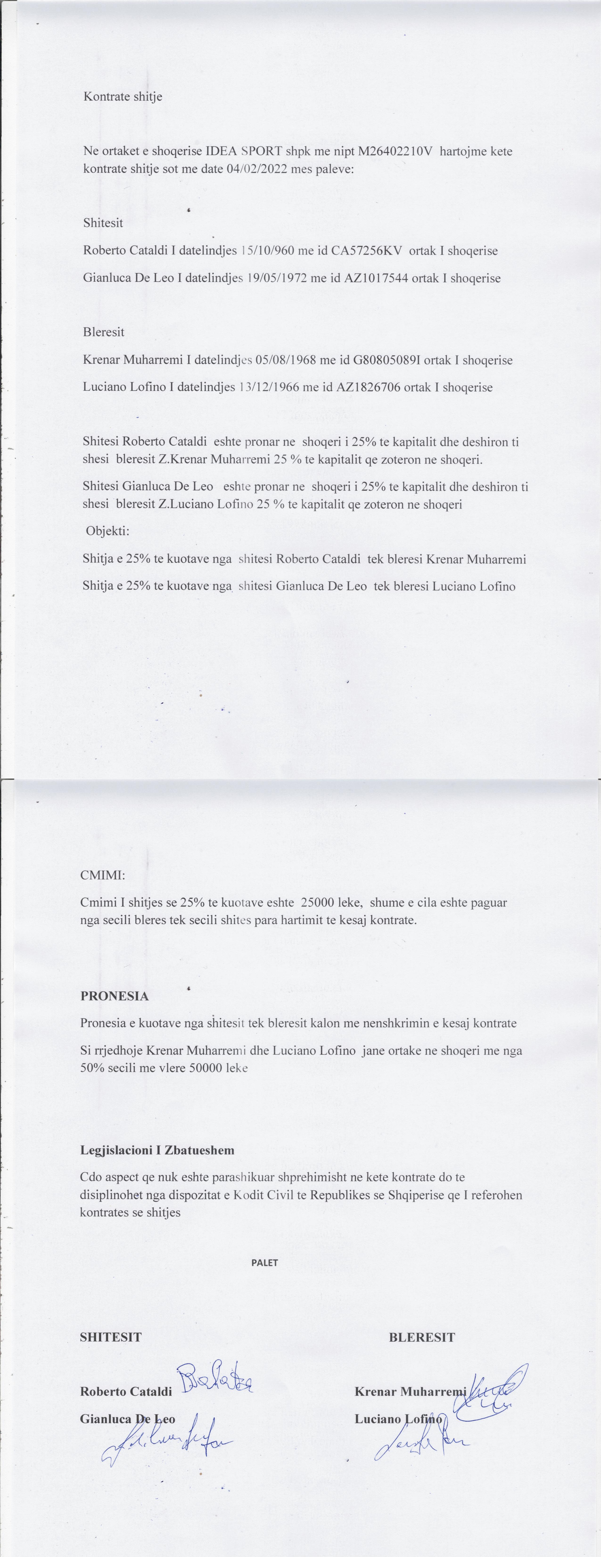 → Ekstrakti Historik i Regjistrit Tregtar date 22.02.2022 → Statuti i Shoqerise → Kontrate e shitjes se kuotave date 04.02.2022 |