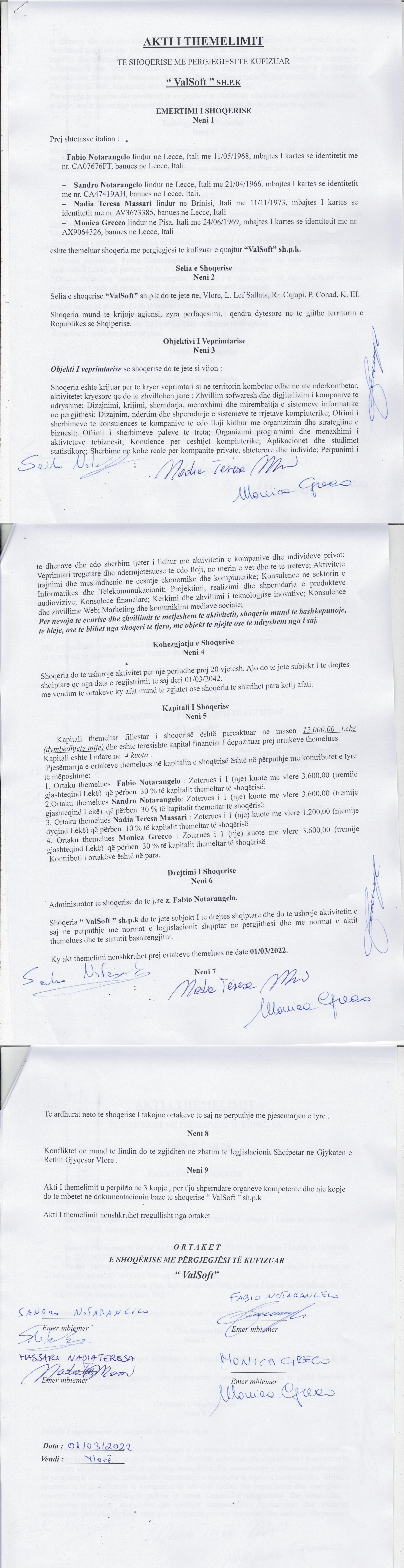 | Objekti i Veprimtarisë: | Shoqeria eshte krijuar per te kryer veprimtari si ne territorin kombetar edhe ne ate nderkombetar, aktivitet kryesore qe do te zhvillohen jane: Zhvillim softwaresh dhe digjitalizim i kompanivete ndryshme. Dizajnimi, krijimi, shperndarja, menaxhimi dhe mirembajtja e sistemeve informatikene pergjithesi. Dizajnim, ndertim dhe shperndarje e sistemeve te rrjetave kompiuterike. Ofrimi i sherbimeve te konsulencs te kompanive te çdo lloji lidhur me organizimin dhe strategjine e biznesit. Ofrimi i sherbimeve paleve te treat. Organizim programimi dhe menaxhimi i aktiviteteve te biznesit. Konsulence per çeshtjet kompiuterike. Aplikacionet dhe studimet statistikore. Sherbime ne kohe reale per kompanit private, shteterore dhe individe. Perpunimi i te dhenave dhe çdo sherbim tjeter i lidhur me aktivitetin e kompanive dhe individeve privat. Ve primtari tregetare dhe ndermjetesuese te çdo llojine emerin e vet dhe te treteve. Aktivitete trajnimi dhe mesimdhenie ne çeshtje ekonomike dhe kompiuterike. Konsulence ne sektorin e informatikes dhe telekomukacionit. Projektimi, realizimi dhe shperndarja e produkteve audiovizive. Konsulence financiare. Kerkimi dhe zhvillimi i teknologjise inovative. Konsulence dhe zhvillime Web, marketing dhe komunikim te mediave sociale. Per nevoja te ecurise dhe zhvillimit te metejshem te aktivitetit, shoqeria mund te bashkepunoje, te bleje ose te blihet nga shoqeri te tjera me objekt te njejte ose te ndryshem nga i saj. |