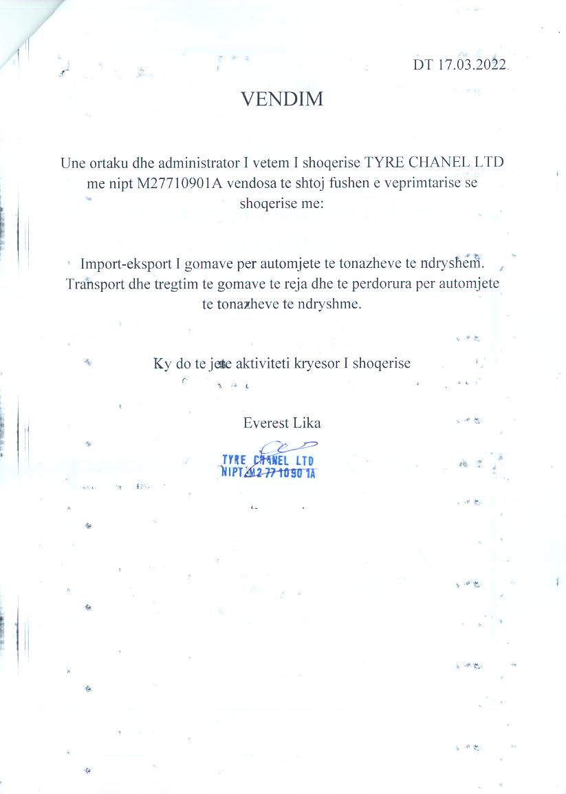| Emërtime të tjera Tregtare: | " TYRE CHANEL LTD" SH.P.K. |