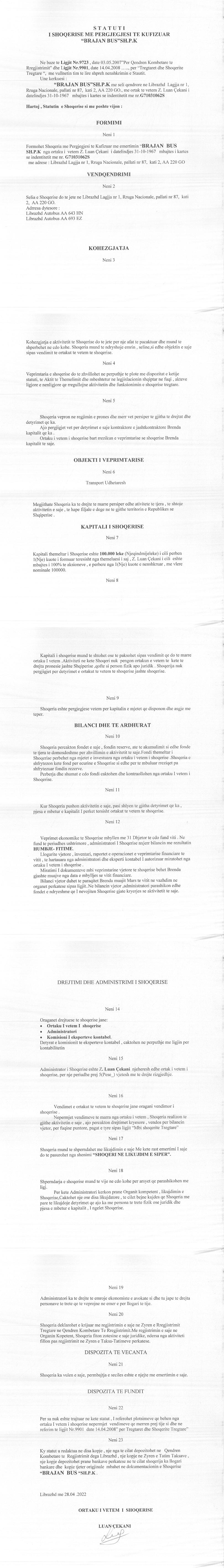 → Ekstrakti Historik i Regjistrit Tregtar date 05.05.2022 → Statuti i Shoqerise |
