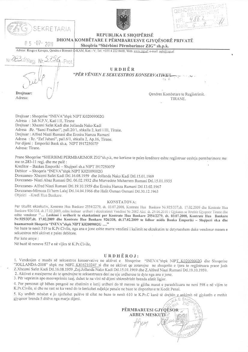 | Çështje Ligjore: | I. Më datë 05.07.2011, me anë të urdhërit nr. 5796 Prot, nr. 283-11 Regj, "Për Vënien e Sekuestros Konservative", e lëshuar nga shoqëria “Shërbimi Përmbarimor ZIG" shpk drejtuar QKR, u urdhërua vendosja e masës së sekuestros konservative në aktivet e shoqërisë “Ineva” shpk dhe shoqërisë “Jollanda-2008” shpk si dhe në aktivet që zotërojnë në shoqëritë e tjera të regjistruara Z. Xhezmi Safet Kadi, Znj. Jollanda Nako Kadi dhe Z. Alfred Niazi Rumani. Aktivet e mësipërme do të qëndrojnë të sekuestruara deri në një urdhëresë të dytë. II. Më datë 15.03.2012, me anë të vendimit Nr. 283-11 Regj, Nr. 06279 Prot. "Për përjashtimin e Sendit nga Sekuestro" e lëshuar nga Shoqëria “Shërbimi Përmbarimor Zig” shpk, u vendos përjashtimi nga sekuestrimi dhe nga proçedura vijuese përmbarimore të aksioneve të shoqërisë "A.S.K. OIL" sha, të sekuestruara për ekzekutimin e urdhërit të ekzekutimit, vendimi nr. 2002 Akti datë 29.06.2010 i Gjykatës së Rrethit Gjyqësor Tiranë. Përjashtimi nga sekuestro shtrihet mbi të gjitha aktivet në zotërim të Jorgo Mano, që figurojnë të regjistruara pranë Qendrës Kombëtare të Regjistrimit. III. Më datë 01.10.2013, me anë të urdhërit Nr. 24938 Prot., lëshuar nga shoqëria "Shërbimi Përmbarimor ZIG" sh.p.k, u vendos masa e sekuestros konservative në kuotat që shoqëria "Erniku" sh.p.k zotëron pranë shoqërisë "Bushtrica Energy 2009", si dhe në shoqëri të tjera të regjistruara. Aktivet dhe kuotat e mësipërme do të qëndrojnë të sekuestruara deri në një urdhëresë të dytë. IV. Më datë 06.02.2017, me anë të urdhërit Nr. 01415 Prot, protokolluar nga QKB me Nr. 1775 Prot., datë 07.02.2017 "Për Heqjen e Sekuestros Konservative”, lëshuar nga Shoqëria Përmbarimore "Shërbimi Permbarimor ZIG", u urdhërua heqja e masës së sekuestro konservative të vendosur me anë të shkresës Nr. 20613, datë 14.08.2013, me shkresën Nr. 24938 Prot., datë 01.10.2013, me shkresën Nr. 26342 Prot., datë 17.10.2013, në aktivet e shoqërisë debitore "Erniku" Shpk, si dhe në kuotat që "Erniku" Shpk zotëron pranë subjektit "SA-GLE KOMPANI" dhe në kuotat që "Erniku"Shpk zotëron pranë subjektit "Bushtrica Energy 2009”. V. Më datë 15.02.2019, me anë të urdhërit Nr. 280 Prot Nr. 1802/1 Dosje, protokolluar në QKB me Nr. 2801 Prot datë 19.02.2019, lëshuar nga shoqëria përmbarimore “TDR”, u urdhërua vendosja e masës së sekuestros konservative mbi të gjitha kuotat dhe aksionet në pronësi të shoqërisë “ERNIKU” shpk dhe kuotat që zotëron në shoqërinë “Bushtrica Energy 2009” sh.p.k. VI. Më datë 27.03.2019, me anë të urdhërit Nr. 541 Prot., Nr.653 Dosje, lëshuar nga shoqëria "Elite Bailiff 's Office" sh.p.k, u urdhërua vendosja e masës së sekuestros konservative mbi të gjitha kuotat/aksionet e zotëruara nga debitori “Bushtrica Energy 2009” sh.p.k. VII. Me date 26.06.2019, me ane te Urdhrit Nr.8090 Prot., Nr.1397 Regj, lëshuar nga Shoqëria Përmbarimore “AEF BAILIFF SERVICE” SHPK, protokolluar nga QKR, me Nr. 8812 Prot., datë 27.06.2019, u urdherua bllokimi i kuotave që ka në emër të tij debitori: Erniku SHPK me NUIS(NIPT) J71925004S, në shoqërinë “Bushtrica Energy 2009” SHPK., me NUIS (NIPT) K98505601E, me qellim mos kryerjen e asnje veprimi i cili mund te ndryshoje te dhënat e regjistrit tregtar. VIII.Me date 19.11.2020, sipas Urdhrit Nr. 192-08 Regj. "Per Venien e Sekuestros Konservative”, protokolluar nga QKB me Nr.10611 Prot., date 23.11.2020, lëshuar nga Përmbaruesi Gjyqësor Privat “Shefik Suparaku , u urdhërua vendosja e mases se sekuestros konservative mbi aksionet/kuotat qe debitori shoqeria “ERNIKU” sh.p.k., me NIPT-J71925004S zoteron tek shoqeria “Bushtrica Energy 2009” shpk, me NIPT- K98505601E si dhe mbi te drejtat qe rrjedhin nga zoterimi i ketyre aksioneve/kuotave duke ndaluar tjetersimin dhe ose disponimin e tyre.Aksionet/kuotat do te qendrojne te sekuestruara deri ne nje urdherese te dyte nga ana e jone. Kreditor: Shoqeria “GJONI-AN” Sh.p.k. Objekti i Sekuestros: Likujdim Faturash Tatimore dhe pagese kamatash ligjore. IX.Me date 27.01.2022, sipas Urdherit Nr. 116-294 Prot., leshuar nga shoqeria "Elite Bailiff ' s Office" sh.p.k, u urdherua heqja e masës së sekuestros konservative mbi te gjitha kuotat/aksionet e zoteruara nga debitori shoqeria “Bushtrica Energy 2009” sh.p.k, me NUIS (NIPT) - K98505601E. Kreditor: Shoqeria “Elva 2001” Sh.a. X.Me date 28.01.2022, sipas Urdhrit Nr.1349/7 Dosje e protokolluar në QKB me Nr. 3787 Prot date 07.02.2022, lëshuar nga Përmbarues gjyqësor Dionis Mekshaj , u urdherua zhbllokimi i aktiveve në shoqërinë Bushtrica Energy 2009 shpk me NIPT K98505601E, të cilat i zotëron debitori shoqëria ERNIKU SHPK me NIPT J71925004S, të vendosura nga përmbaruesi gjyqësor privat Shefik Shuparaku me Shkresën Nr. 192-08 Regj, datë 19.11.2020. XI.Me date 13.09.2021, sipas Urdherit Nr. 269/2 Prot., Nr. 1397 Regj., protokolluar nga QKB date 24.02.2022, lëshuar nga Shoqëria Përmbarimore “AEF” SHPK., u urdherua heqja e mases se sekuestros konservative për debitorin shoqeria “Erniku”SHPK me Nipt J71925004S në kuotat që zotëron si ortake në shoqërinë “Bushtrica Energy 2009” SHPK me Nipt K98505601E, pasi debitori ka shlyer detyrimin. Kreditor: Shoqeria “ Lialb Gaz Energy” Sh.a. XII.Me date 11.03.2022, sipas Urdherit Nr. 262 Prot, Nr. 1802/11 Dosje, lëshuar nga Shoqeria Përmbarimore private “ TDR GROUP” shpk u urdherua Qendra Kombëtare e Biznesit ( QKB-Tiranë) të zhbllokojë nga masa e sekuestros konservative të gjitha kuotat dhe aksionet në pronësi të shoqërisë “ERNIKU” shpk me NIPT J71925004S që zotëron në shoqërinë “ Bushtrica Energy 2009” shpk me NIPT K98505601E bllokuar me shkresën Nr. 280 Prot datë 15.12.2019 të zyrës së Përmbarimit privat “ TDR GROUP
