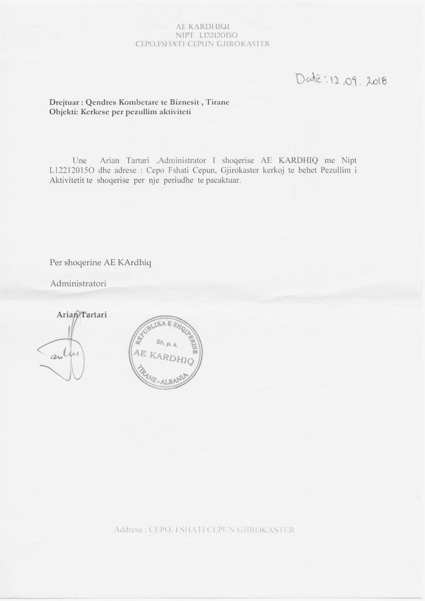 | Çështje Ligjore: | Më datë 12.09.2018, me kërkesë të administratorit Arian Tartari, u pezullua aktiviteti i shoqërisë për një periudhë të pacaktuar. Statusi i shoqërisë ndryshoi nga “Aktiv” në “Pezulluar”. |