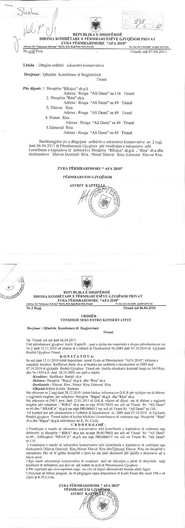 | Çështje Ligjore: | I. Më datë 06.04.2010, Zyra Përmbarimore AFA 2010 ka lëshuar urdhër për vendosje të sekuestros konservative mbi kontributin e kapitaleve të zotëruara nga debitorët, shoqëria RIRA sha dhe shoqëria Rrajca shpk, si dhe vendosjen e masës së sekuestros konservative mbi aksionet e zotëruara nga dorëzanësit Xhevat Demirali Rira, Nimet Xhevat Rira dhe Edmond Xhevat Rira në shoqëritë e mësipërme dhe në të gjitha shoqëritë e tjera ku ata janë aksionerë për pjesën e aksioneve që u takon atyre. Kjo masë sekuestro vendoset deri në shlyerjen e plotë të detyrimit, kthimin e kredisë bankare ndaj Raiffaisen Bank sh.a, pra deri në një urdhër të dytë të Përmbaruesit Gjyqësor. II. Më datë 28.04.2015, Shoqëria Përmbarimore “Elite Bailiff’s Office”shpk ka lëshuar urdhrin Nr. 843-299 Prot., për vendosjen e masës së sekuestros konservative mbi kuotat/aksionet e aktivitetit tregtar që zotëron debitori, shoqëria ”Romano Port” sha me qëllim mostjetërsimin e tyre dhe shlyerjen e detyrimit ndaj kreditorit Bashkim Haziz Vladi. Dokumentacioni do të qëndrojë i bllokuar deri në një urdhër të dytë. III. Më datë 19.02.2016, Shoqëria Përmbarimore “Elite Bailiff’s Office” shpk ka lëshuar një urdhër Nr.341-233 Prot, për heqjen e masës së sekuestros konservative mbi çdo dokumentacion që mund te jetë bllokuar të shoqërisë "Romano Port” sh.a, meqenëse pala debitore e ka likuiduar në total detyrimin që kishte nda kreditorit Bashkim Haziz Vladi. IV. Me date 17.05.2021, me ane te urdhrit Nr.1051 Prot.,Nr.97-21 Regj, protokolluar nga QKB, me Nr. 4865 Prot., datë 17.05.2021, lëshuar nga Shoqëria "Shërbimi Permbarimor Astrea”, u urdherua vendosja e sekuestros konservative mbi aktivet e shoqërisë, “ROMANO PORT” SHA, me NUIS(NIPT) – K51625501O, deri në një urdhër të dytë. V.Me date 03.05.2023, eshte depozituar i Urdhri Nr. 1374 Prot., Nr. 97-21 Regj, lëshuar nga Përmbarues Privat Ardit Hajdini, pranë Zyrës së Përmbarimit Privat “ASTREA”SHPK, protokolluar nga QKB me Nr. 9735 Prot., datë 04.05.2023, ku është urdhëruar: Heqja e masës së sekuestros konservative në aktivet e debitorit ”ROMANO PORT” SHA, pajisur me NUIS (NIPT) K51625501O, të vendosur me Urdhrin Nr. 1051 Prot., datë 17.05.2021, të Zyrës së Përmbarimit Privat “ASTREA” SHPK. |