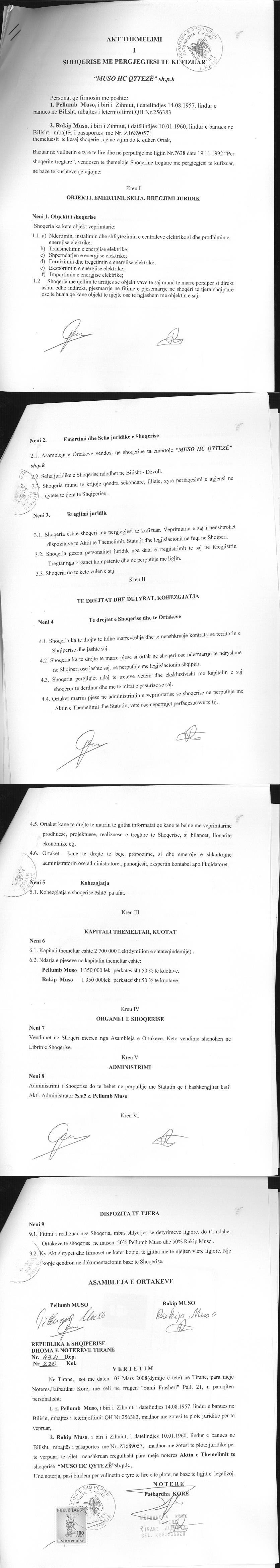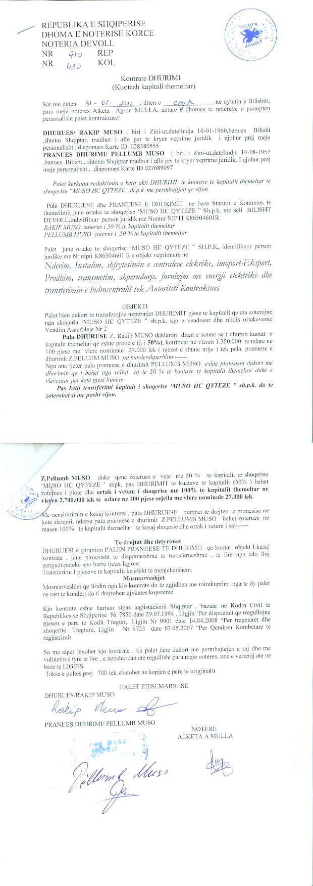 | Objekti i Veprimtarisë: | Ndërtim, instalim, shfrytëzim i centraleve elektrike, import-eksport, prodhim, transmetim, shpërndarje, furnizim me energji elektrike dhe transferimin e hidrocentralit tek Autoriteti Kontraktues.