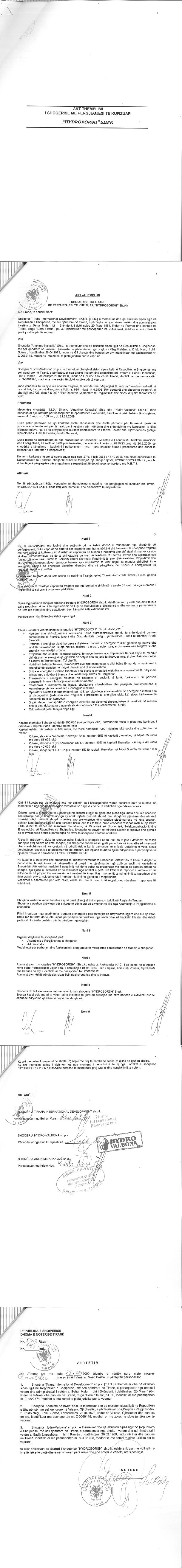 | Objekti i Veprimtarisë: | Ndërtimi, operimi dhe transferimi i hidrocentraleve "Fterre" dhe "Fterre 1" tek Autoriteti Kontraktues, ku përfshihet financimi, ndërtimi, vënia në punë, prodhimi, furnizimi, transmetimi, shpërndarja, eksportimi dhe shitja e energjisë elektrike në zbatim të kontratës së Konçesionit nr. 6072 Rep, Nr. 2270 Kol date 31. 05. 2009.