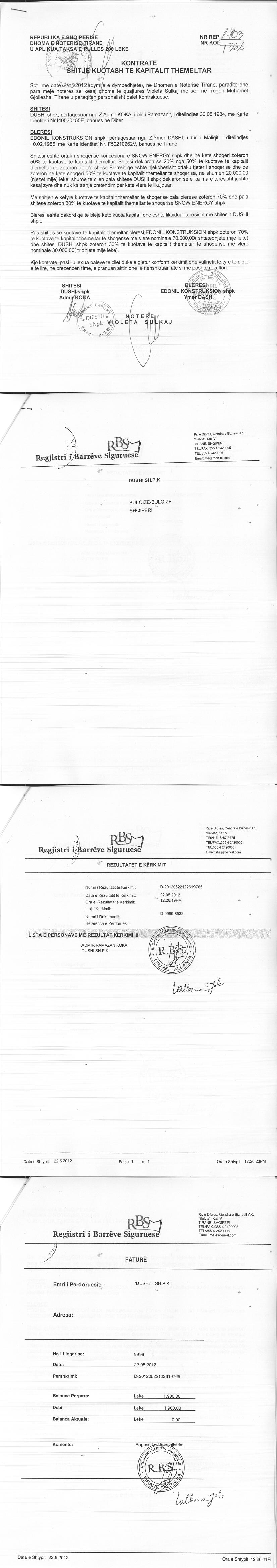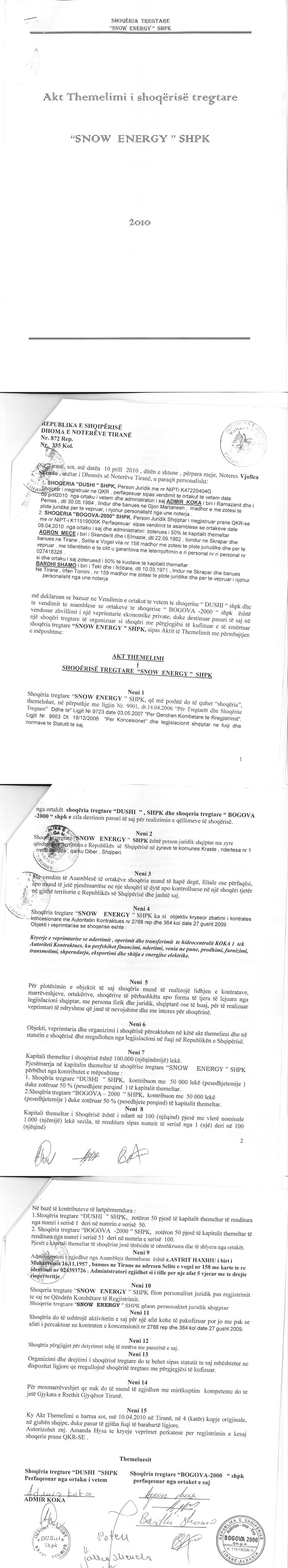 | Shënime: | Shoqëria “Snow Energy” është një shoqëri konçesionare e krijuar nga bashkimi i përkohshëm i shoqërive “Dushi” sh.p.k dhe “Bogova 2000” shpk (tani Edonil Konstruksion), për zbatimin e kontratës konçesionare me Ministrinë e Ekonomisë, Tregtisë dhe Energjetikës, të nënshkruar më datë 27.08.2009. Objekti i kontratës është financimi, projektimi, ndërtimi, vënia në punë, administrimi, mirëmbatja e hidrocentralit “Koka 1” dhe transferimi i tij tek Autoriteti Kontraktues, konform kushteve dhe afateve të kësaj kontrate. Hidrocentrali “Koka 1” do të ndërtohet në përroin Zalli i Liconës, rrethi Bulqizë, me këto karakteristika: Fuqia e instaluar 2500 kW dhe prodhimi vjetor i energjisë elektrike 12.410.000 kWh. |