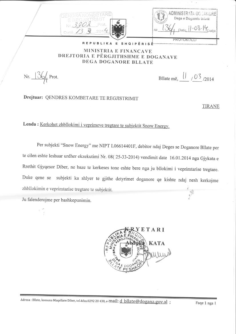 | Çështje Ligjore: | I. Më datë 26.09.2012, u nënshkrua marrëveshja siguruese Nr. 2089 Rep., Nr. 923 Kol., për vendosjen e barrës siguruese mbi 100% të kuotave të shoqërisë “Snow Energy”, në favor të barrëmarrësit “Banka Kombëtare Tregtare”. Kjo marrëveshje është lidhur ndërmjet kredidhënësit Banka Kombëtare Tregtare Sh.a dhe barrëdhënësit: “Edonil Konstruksion” sh.p.k dhe “DUSHI” Shpk, në cilësinë e ortakëve të shoqërisë “Snow Energy” sh.p.k. Barrëdhënësit kanë rënë dakord të barrësojnë kuotat që zotërojnë në shoqërinë me përgjegjësi të kufizuar “Snow Energy” shpk, në masën respektive prej 70% dhe 30% që ato zotërojnë, duke plotësuar totalin e 100% të aksioneve të shoqërisë kredimarrëse. II. Më datë 10.12.2013, u nënshkrua marrëveshja e pengut Nr. 3104 Rep., Nr. 1424 Kol., me kolateralmarrës: Banka Kombëtare Tregtare Sh.a dhe Kolateraldhënës: Snow Energy sh.p.k. Me nënshkrimin e kësaj marrëveshje, kolateraldhënësi, vendos peng në favor të kolateralmarrësit të gjitha kuotat, që përfaqësojnë 100% të kapitalit të shoqërisë “Snow Energy” Shpk, me qëëlimin sigurimin e detyrimeve të shoqërisë “Stravaj Energy” sh.p.k që rrjedhin nga kontrata e kredisë Nr. 3102 Rep., Nr. 1422 Kol., datë 10.12.2013, të lidhur me BKT Sh.a, në shumën 550.000.000 (pesëqind e pesëdhjetë milion) lekë. III. Më datë 12.02.2014, me anë të shkresës Nr. 136 të Degës së Doganës Bllatë, u kërkua bllokimi i çdo veprimi tregtar që ka lidhje me subjektin “Snow Energy”, për shkak të detyrimeve të papaguara të këtij subjekti prej 9.107.383 (nëntë milion e njëqind e shtatë mijë e treqind e tetëdhjetë e tre) lekë. IV. Më datë 11.03.2014, me anë të shkresës Nr. 136/1 Prot., të Degës së Doganës Bllatë, u kërkua zhbllokimi i veprimtarisë tregtare të subjektit “Snow Energy”, pasi ka shlyer të gjithë detyrimet doganore. V. Më datë 08.06.2015, u nënshkrua marrëveshja e pengut Nr. 1181 Rep., Nr. 429 Kol., ndërmjet kolateralmarrësit "Banka Kombëtare Tregtare" sh.a dhe kolateraldhënësit "SNOW ENERGY" shpk. Me nënshkrimin e kësaj marrëveshje dhe sipas kushteve të përcaktuara në të, kolateraldhënësi, me vullnet të shprehur të ortakëve "Edonil Konstruksion" shpk dhe "Dushi" shpk në Vendimin e Asamblesë të datës 08.06.2015, vendos peng në favor të Kolateralmarrësit të gjitha kuotat, që përfaqësojnë 100% të kapitalit të shoqërisë "Snow Energy" shpk, si dhe të gjitha të drejtat dhe pretendimet lidhur me to me qëllim sigurimin e detyrimeve të shoqërisë "Stravaj Energy" shpk që rrjedhin nga Kontrata e Kredisë Nr. 1175 Rep., Nr. 423 Kol., datë 08.06.2015, të lidhur me BKT sha- Dega Sauk, për shumën shtesë 80.000.000 (tetëdhjetë milion) lekë. |