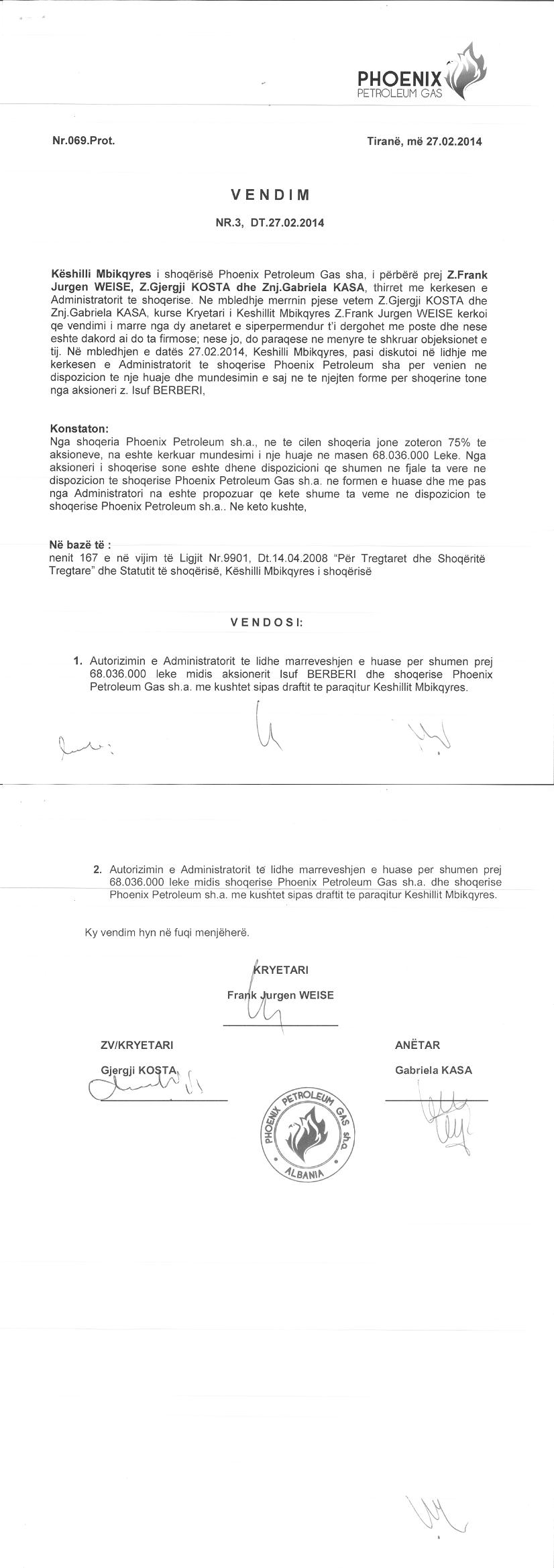 → Kompanite koncesionare ne industrine hidrokarbure 2018 (AKBN) → Ekstrakt historik i regjistrit tregtar 18.03.2023 → Akti i themelimit te shoqerise → Kontrate per blerje aksionesh 13.01.2014 → Vendimi i asamblese se aksionereve per zmadhimin e kapitalit 01.02.2014 → Vendimi per marreveshjen e huase 27.02.2014 → Urdher per venien e sekuestros konservative 26.11.2015 → Urdher per heqjen e sekuestros konservative 28.12.2015 → Urdher per vendosjen e sekuestros konservative 23.01.2018 → Urdher per heqjen e sekuestros konservative 29.01.2018 → Kontrate shitje aksionesh date 15.07.2021 → Kontrate shitje aksionesh date 16.09.2021 → Situata aktuale e licensimit per marreveshjet hidrokarbure sipas AKN date 18.03.2023 → Ekstrakti Historik i Regjistrit Tregtar date 27.03.2024 |